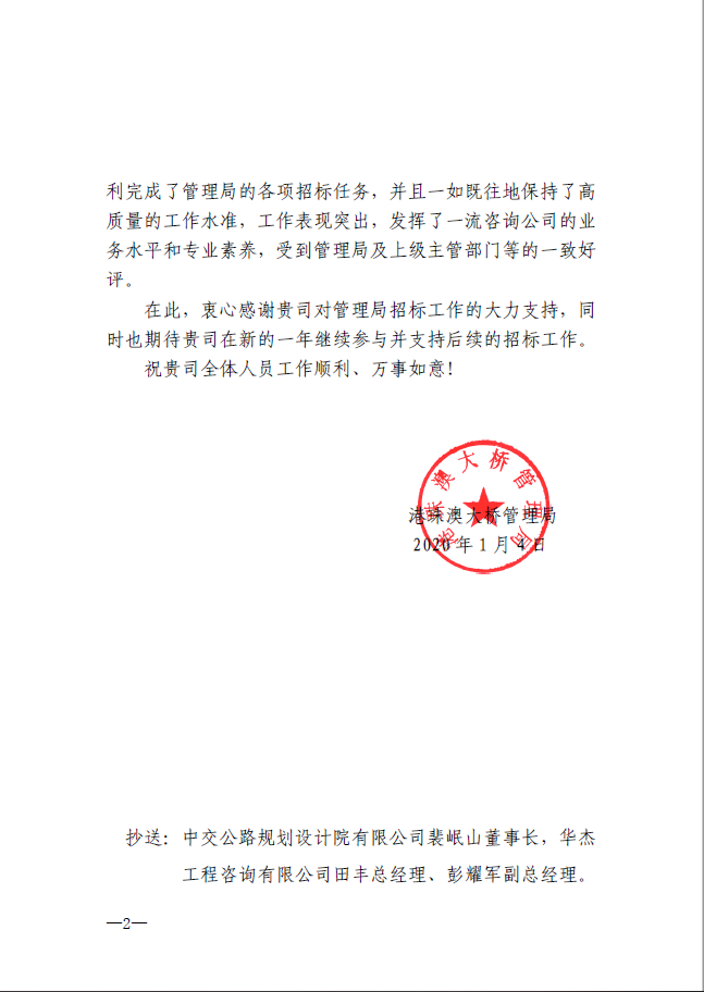 近日,公司收到業(yè)主單位港珠澳大橋管理局發(fā)來的感謝信。在港珠澳大橋主體工程建設(shè)期,公司提供了優(yōu)質(zhì)的項目管理和招標(biāo)咨詢服務(wù);大橋進(jìn)入運(yùn)營期后,公司繼續(xù)為大橋防洪影響后評估、東人工島旅游(藍(lán)海豚島)及配套設(shè)施開發(fā)總體策劃及概念設(shè)計、機(jī)電日常養(yǎng)護(hù)等項目提供了全過程的招標(biāo)代理服務(wù)。華杰公司招標(biāo)三部團(tuán)隊以高度負(fù)責(zé)、銳意進(jìn)取、求真務(wù)實的工作態(tài)度,一如既往地保持了高質(zhì)量的工作水準(zhǔn),獲得了業(yè)主的表揚(yáng)。